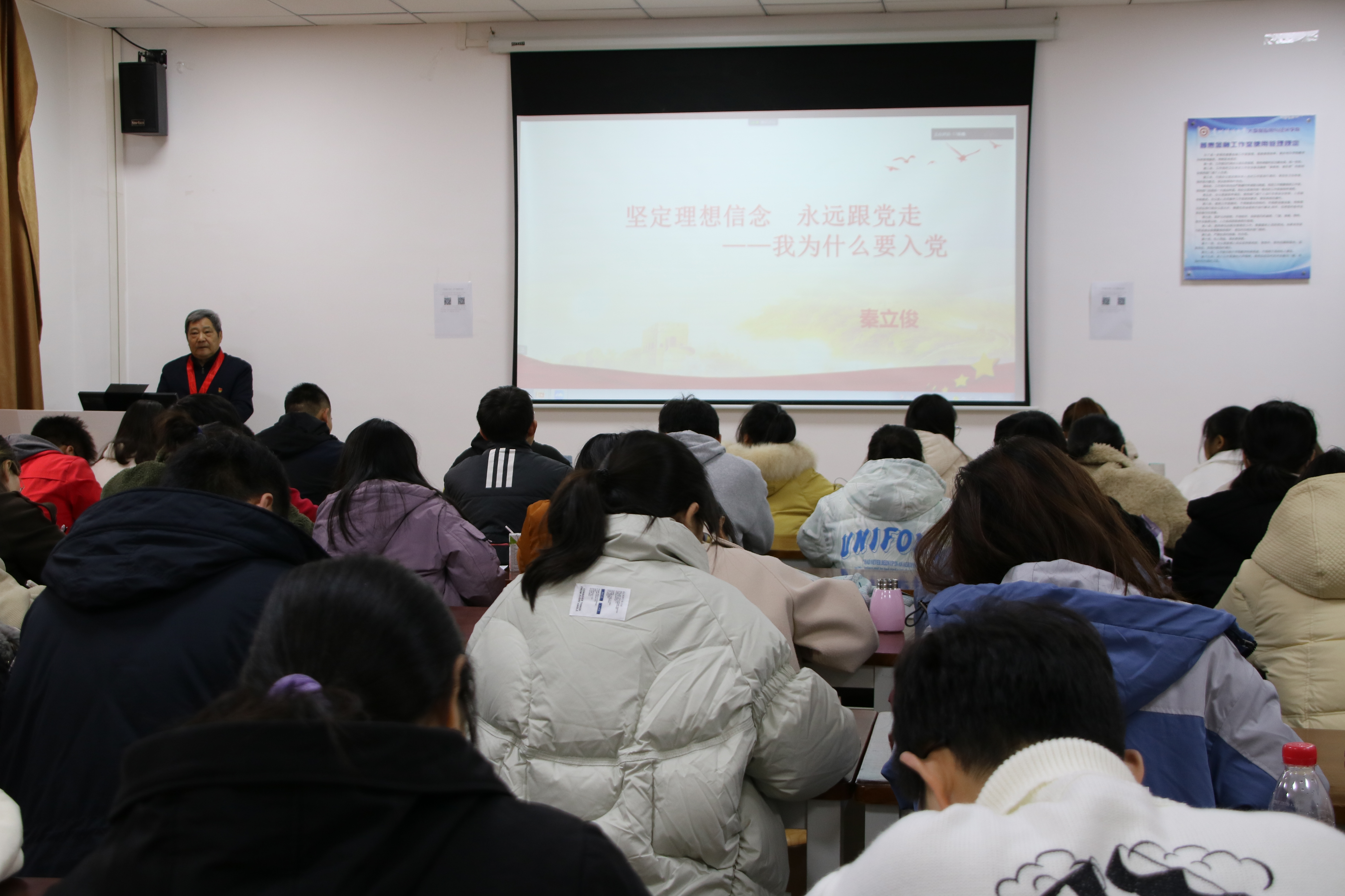 首先,秦立俊老师指出,坚定理想信念的关键在于毫不动摇地坚持党的领导,一名合格的共产党党员,要在思想上先入党,即坚持党的领导,坚定党的信仰。思想是行动的先导,只有统一思想,才能统一行动,遵守好为人民服务的根本宗旨。随后,秦老师强调,了解自己为什么要入党、如何入党,是作为一名入党积极分子应有的思想觉悟。学员们应深刻认识到,中国共产党是中国特色社会主义事业的领导核心,入党不仅是认识党、热爱党、发展党和捍卫党的过程,更是体现自己为实现远大理想而不懈奋斗的过程。最后,秦老师指出了青年一代的使命担当——赓续红色基因,坚定理想信念。青年一代要有强烈的民族自信心和民族自豪感,要在学习和社会实践中丰富自己的学识,用行动践行初心使命。