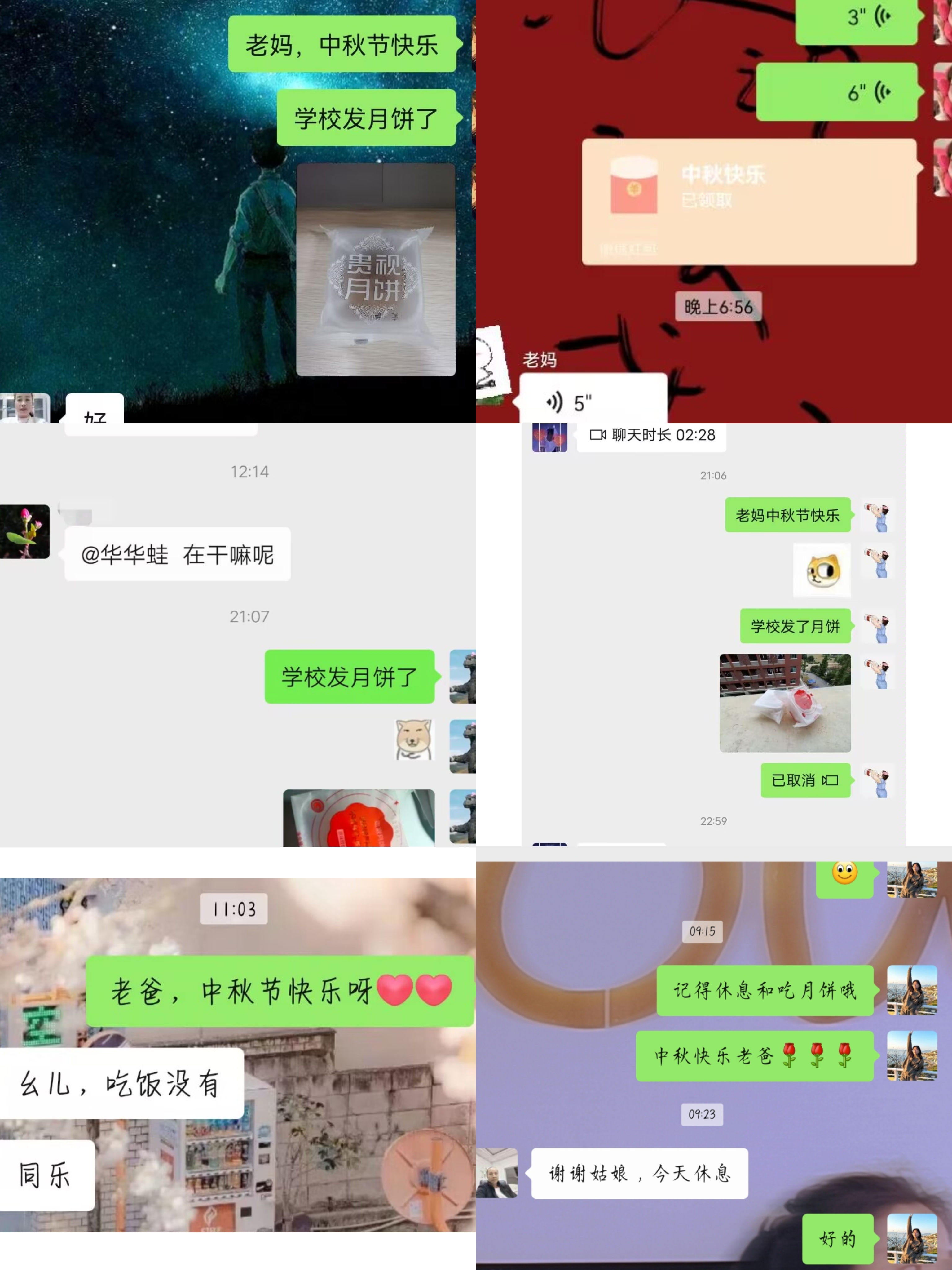 活动号召同学在中秋节当天,用在线联系的方式为家里人送上我们的祝福。同学们极响应,他们通过电话、视频连线、制作小短片等方式向家人分享了公司发放的月饼,并向家里人送上了诚挚的中秋祝福,用不同以往的方式和家人一起欢庆中秋佳节。