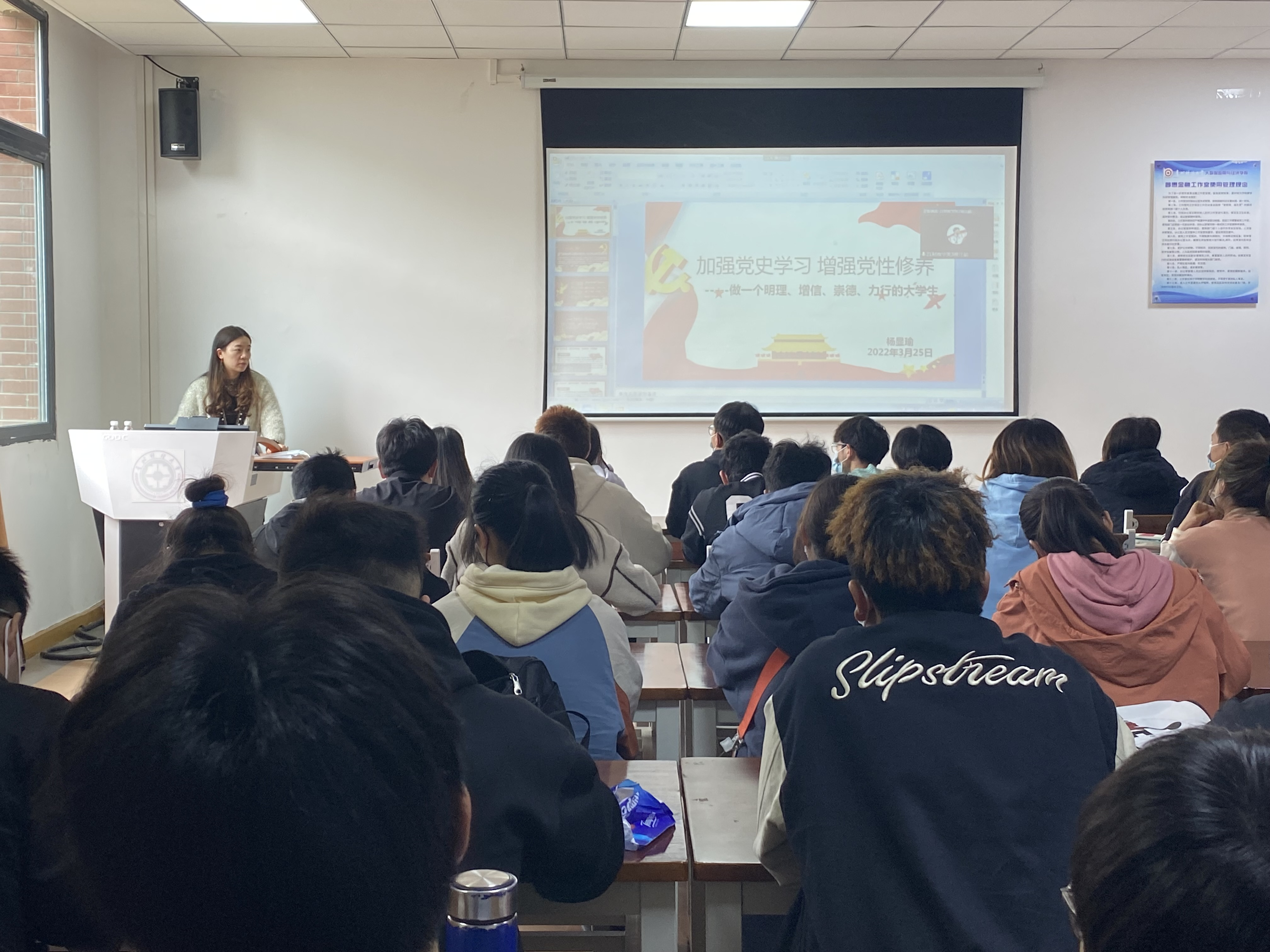 3月25日中午,公司杨显瑜老师于明德楼普惠金融教室为同学们讲授春季团课暨“青马工程”培训第三课《加强党史学习,增强党性修养》。线上174人,线下50人,共计224人参加此次培训班。