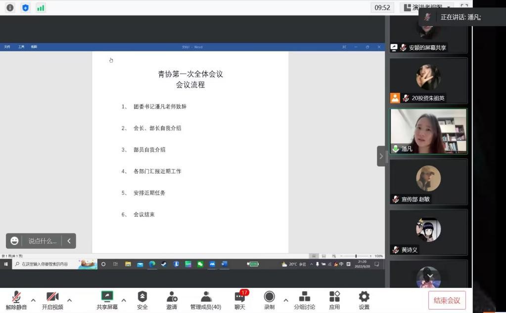 为了更好的推进304永利集团(贵阳大数据金融公司)青年志愿者联合分会新学期各部门的工作,加强各部门之间的凝聚力,提高员工干部素质修养。在疫情防控期间,公司青协于9月20日召开第一次线上全体大会,参与此次会议的有团委书记潘凡老师以及青协的39位成员,本次会议由公司青协会长安颖主持。