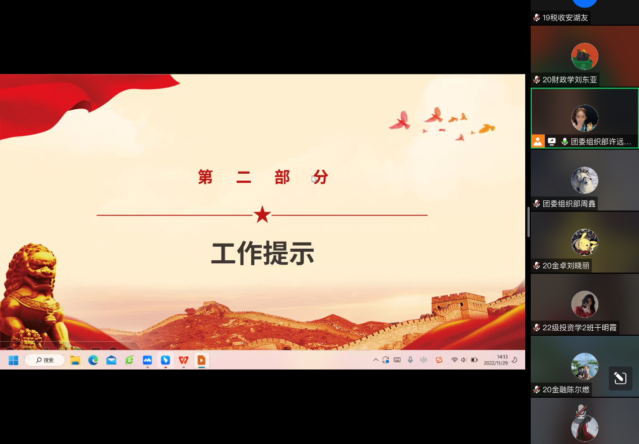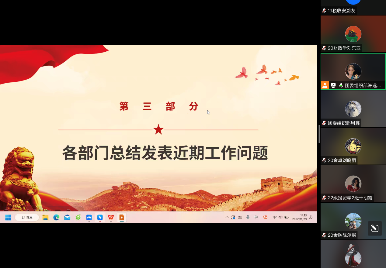 最后办公室部长廖佳玲和组织部部长周鑫总结发表近期的工作问题。廖佳玲指出青年大学习是团员加强思想建设的重要途径,各团支书提交材料时要注意文件命名及格式问题、内部工作协调问题。周鑫结合基础团务工作经历分享了在组织团员参与工作的心得,为团支书提供了工作上的新思路。