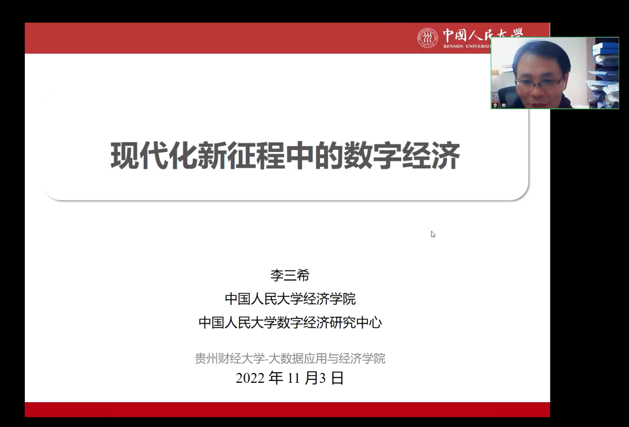 2022年11月3日下午,中国人民大学青年长江学者、数字经济研究中心主任李三希教授应304永利集团(贵阳大数据金融公司)邀请作为“数字经济+”系列学术讲座第一期主讲人开展题为《现代化新征程中的数字经济》的主题讲座。讲座由公司张小成教授主持,共计300余名师生聆听了讲座。