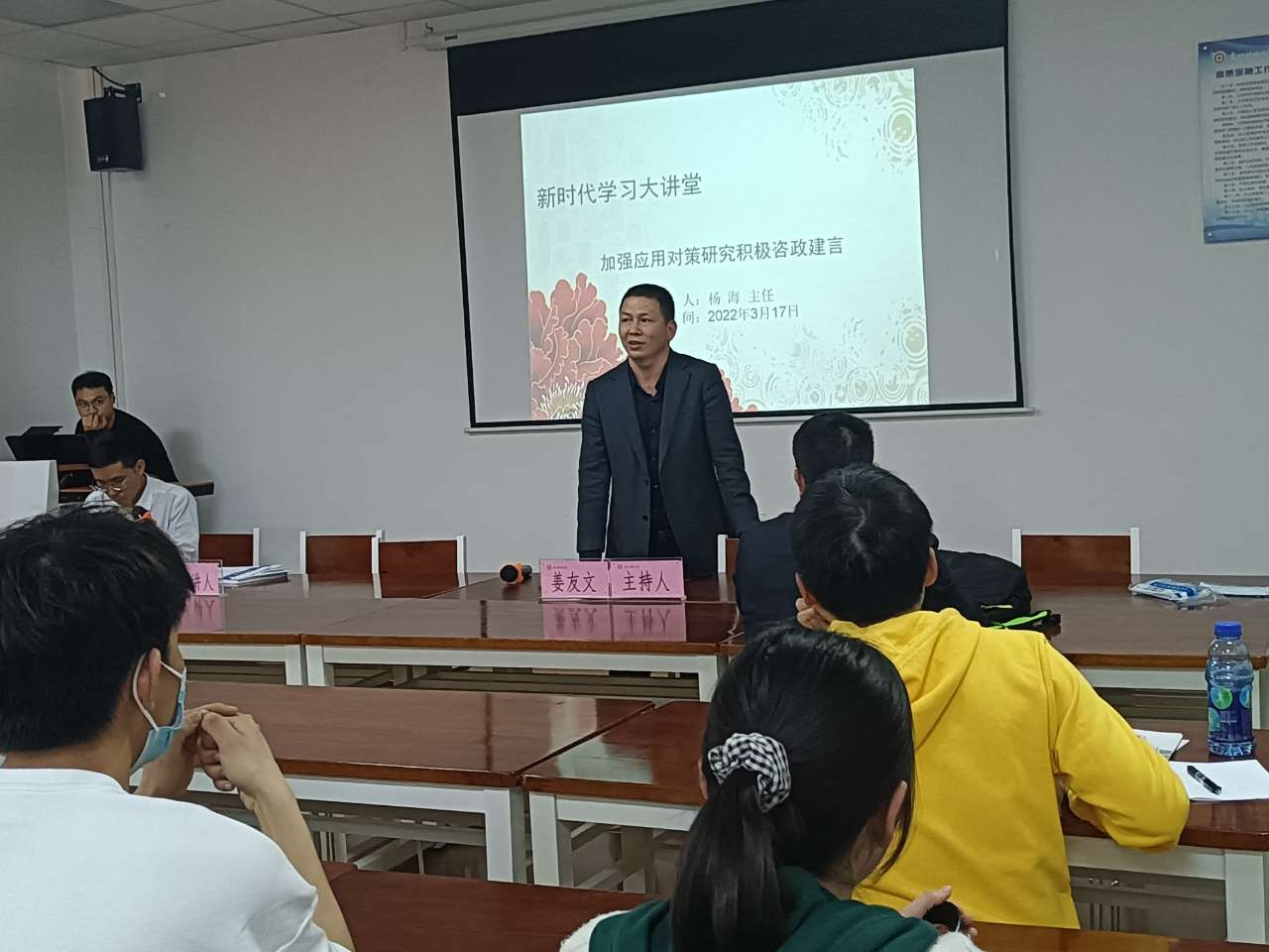 2022年3月17日下午两点,应304永利集团(贵阳大数据金融公司)的邀请,杨海主任做客“财富论坛”暨新时代学习大讲堂,作题为“加强应用对策研究积极咨政建言”的主题讲座。讲座由304永利集团(贵阳大数据金融公司)公司党委书记姜友文书记主持,公司师生共50余人聆听了讲座。