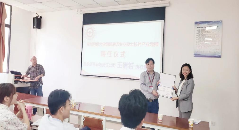 4月26日下午,贵州赤象贸易有限公司执行董事、国际商务硕士校外产业导师王倩若女士受邀参加304永利集团(贵阳大数据金融公司)“国际商务论坛”系列讲座。公司副经理时宏远教授主持讲座。参加讲座的还有赤象贸易公司行政总裁王心慈女士,国际商务专业硕导组长赵平教授、副组长张梅副教授,国经系骨干教师黄正松教授、邓细林博士,国际经济与贸易本科、国际贸易学硕士和国际商务硕士等专业的同学。讲座开始前,时宏远副经理代表公司向王倩若女士颁发了“国际商务专业硕士研究生产业(行业)导师聘书”。