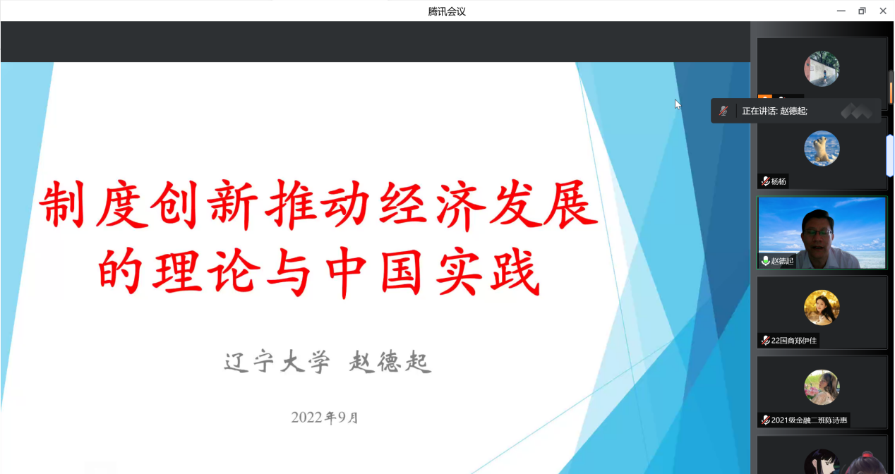 9月13日,辽宁大学亚澳商公司经理赵德起教授应邀做客贵304永利集团官网入口,作题为《制度创新推动经济发展的理论与中国实践》的线上学术讲座。讲座由贵304永利集团官网入口304永利集团(贵阳大数据金融公司)经理杨杨主持,公司师生300余人聆听了讲座。