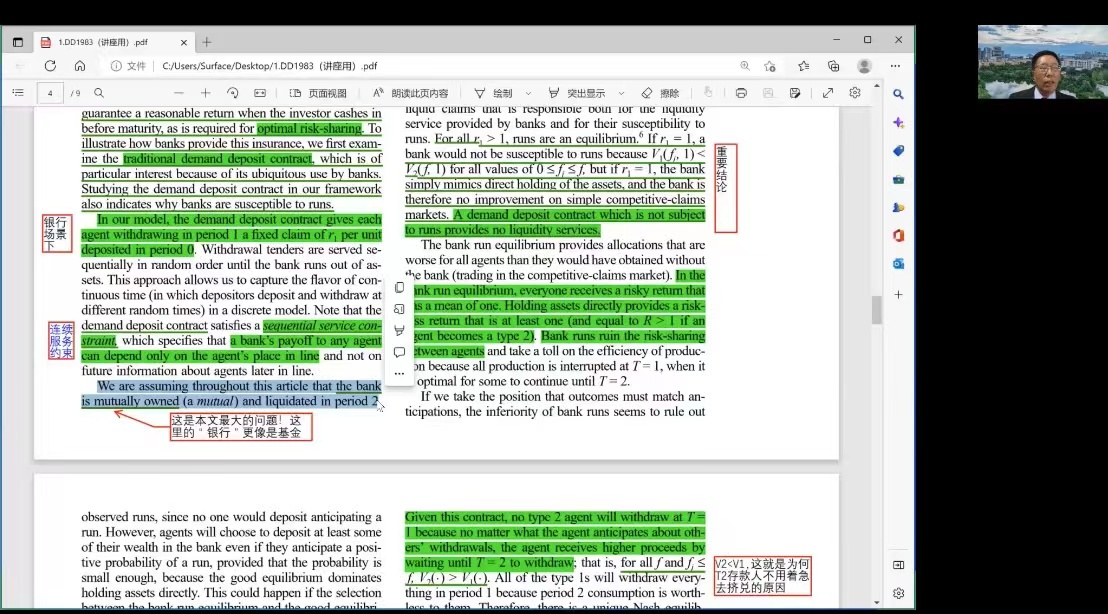 张桥云教授的讲座主要分为两个部分。第一部分:介绍诺贝尔经济学奖经典文章的时代背景、文章的结构与逻辑、研究所用的理论与方法、以及相关结论与启示。随后张教授通过引入“银行会消失吗?银行向何处去?”这一问题,论证了银行倒闭是经济衰退发展成为严重和长期萧条的决定性因素这一核心观点。第二部分:张桥云教授引用论文《Bank Runs,Deposit Insurance,and Liquidity》,以模型为线索,先后为大家介绍了“投入-产出的三期模型”、“两类投资者模型”的构建思路与意义,由此向同学们充分讲述揭示了银行的本质、内在的脆弱性以及银行危机的严重经济后果。相关模型的解析使同学们在理解过程中,更深刻地体会到文章所蕴含的内部逻辑。