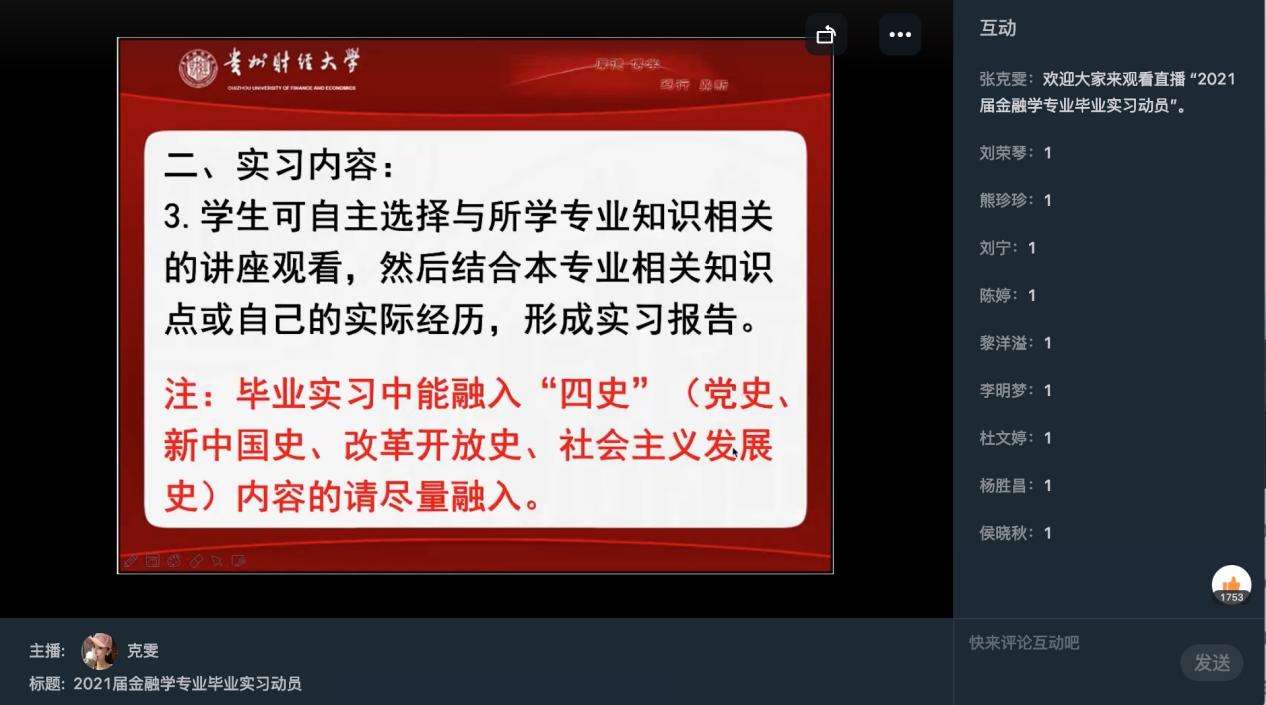 1月6日,304永利集团(贵阳大数据金融公司)金融系副主任张克雯,通过直播的形式向2017级全体金融学专业员工进行了毕业实习动员。