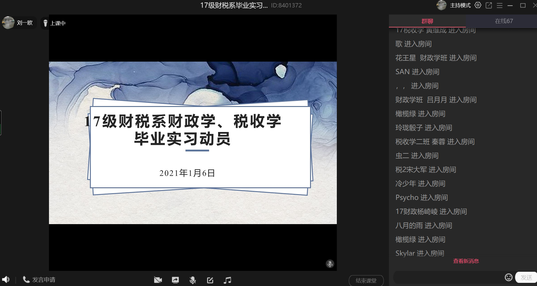 为了提高公司财税系同学的毕业实习工作进展效率,帮助2017级财税系同学能进一步了解实习期间所需要注意的各项内容事宜。1月6日晚上7点,公司财税系副主任刘一欧、魏彧通过腾讯视频会议,线上为2017级财政学和税收学两个专业的同学做了毕业实习动员。财政学和税收学专业的全体同学参加了此次毕业实习动员大会。