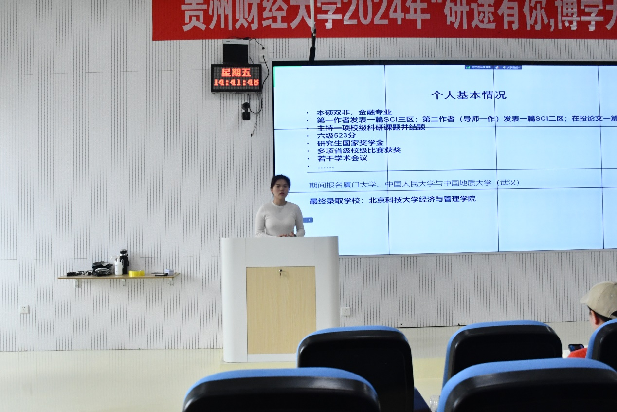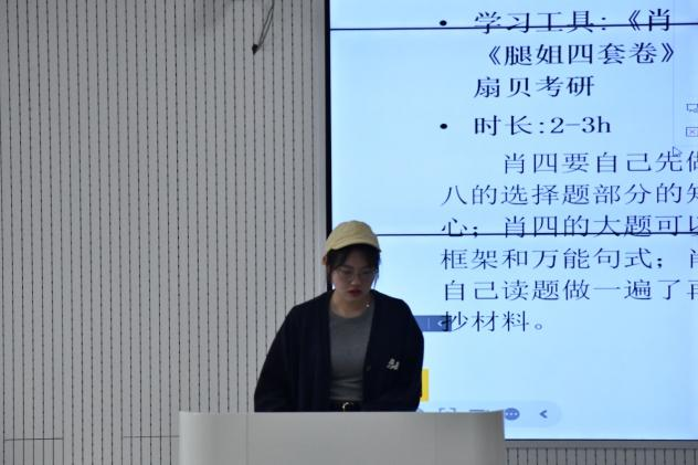 其二,是考博升学经验分享。陈诗惠同学(21级金融专硕,将就读于北京科技大学)就择校选导、准备材料、报名时间、复试要求等具体申博流程进行了详细讲解,并提供了如何选择以及联系导师的小技巧。她强调,读博要有坚定的信念和不懈的努力,也要具备一颗强大的心去迎接科研挑战。
