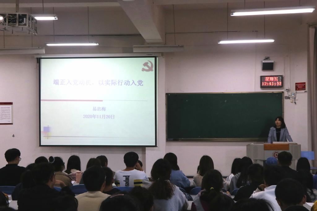 为引领入党积极分子通过正确的道路向党组织靠拢,11月20日中午,公司易忠梅老师于进学楼1-1为入党积极分子讲授题为《端正入党动机,以实际行动入党》的专题党课。2020年秋季入党积极分子全体学员参与本次党课。
