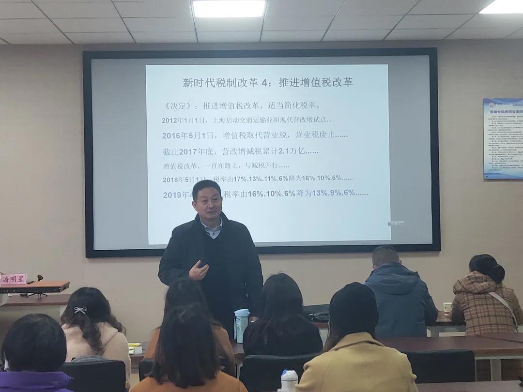 在讲座中,潘明星教授介绍了十八大以来我国的税制改革成就,总结了税制改革的特点:全方位、开创性、深层次、根本性。结合实例为同学们生动形象地介绍了新时代、新思想、新矛盾、新目标、新部署背景下的税制改革。