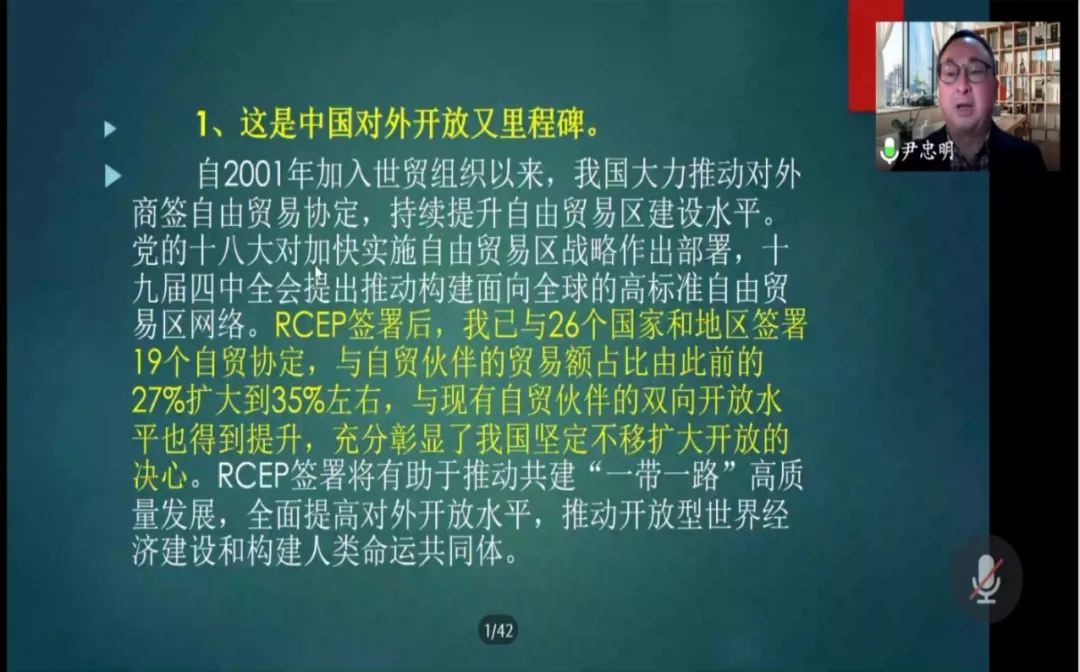 讲座伊始,杨杨经理简要介绍了尹忠明教授,随后,尹忠明教授从RCEP的内容、意义、影响、展望分别展开了讲解。在内容上,他围绕协议中的条款逐条进行了解析;在意义上,他指出RCEP的签署既是区域经济一体化的标志性事件,也是我国继加入世贸组织后又一重大的开放成果,对推动新一轮高水平开放、开拓合作共赢新局面产生深远影响,对促进全球经济复苏、维护多边贸易体制发挥重要的积极的作用;在影响上,他分析了拜登就任总统后对我国对外贸易格局的影响;在展望上,他指出,中国将借RECP之力,推进区域及全球经贸合作。同时,美国将面临更大压力,或急切团结盟友以求反击;世界将继续拥抱自由贸易,全球化体系有望修复。