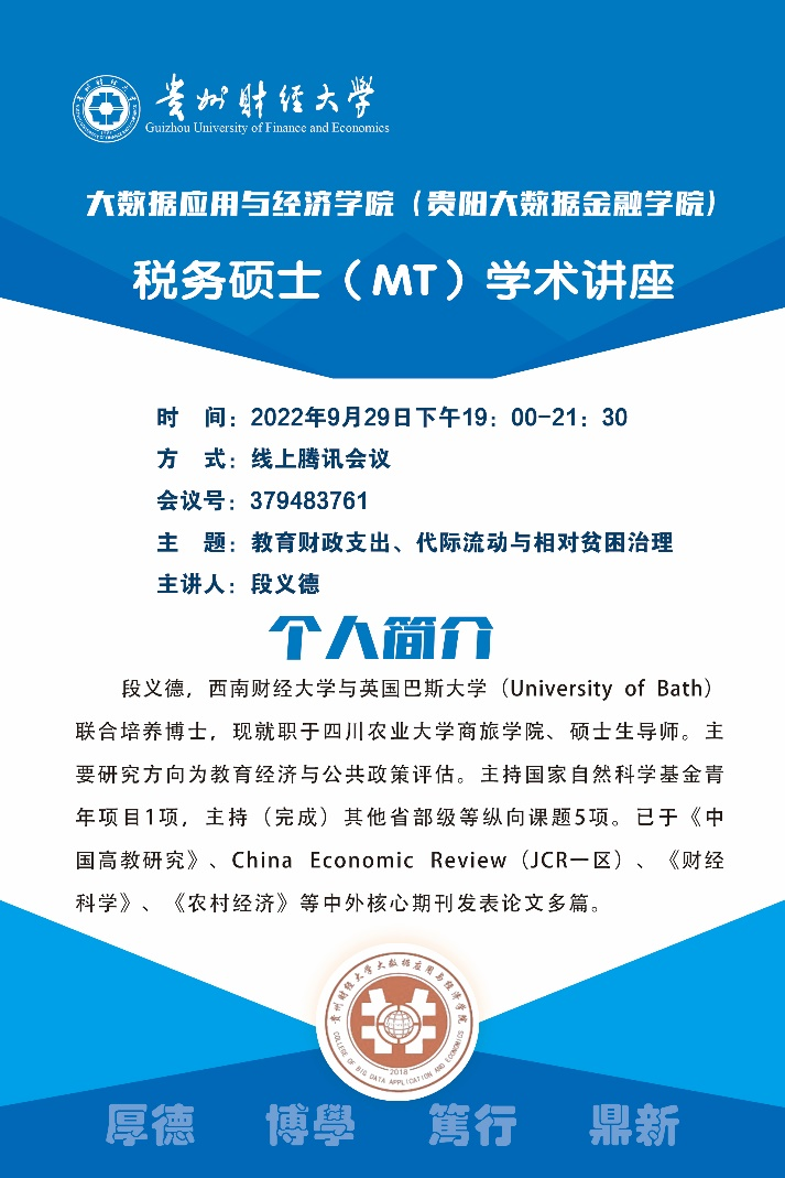 2022年9月29日,应304永利集团(贵阳大数据金融公司)邀请,西南财经大学与英国巴斯大学(University of Bath)联合培养博士、四川农业大学商旅公司硕士生导师段义德做客“税务硕士(MT)学术讲座”,作题为《教育财政支出、代际流动与贫困治理》的主题讲座。讲座由304永利集团(贵阳大数据金融公司)教师傅得晟主持,税务2022级全体新生聆听讲座。