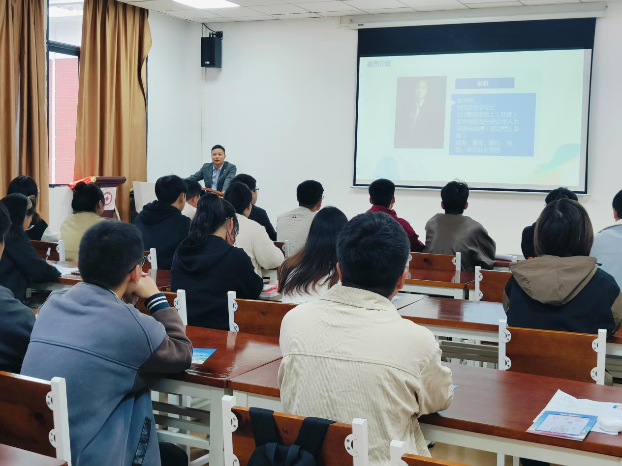 第一环节由新华保险贵州分公司人力资源总经理张羽主讲。张羽经理在简单自我介绍后就中国寿险行业的历史发展机遇进行分享。通过张羽经理的生动讲解,同学们对中国当前寿险业的未来发展前景有了简单的了解。张羽经理随后对新华保险公司相关信息进行了较为详细的讲解,同学们也对公司发展历史、股权架构、公司文化、机构布局等相关信息有了较为全面的认识。之后,张羽经理分享了新华保险公司培养体系、薪酬福利待遇和职场环境,并重点介绍了校园招聘信息和贵州分公司情况。在张羽经理主讲过程中,多次与同学们互动,同学们积极回答其提问,整个环节交流愉快,气氛融洽。