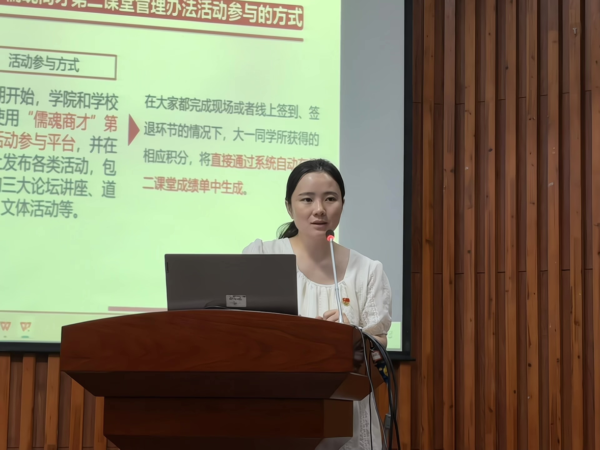 公司团委书记潘凡老师为新生细心讲解了第二课堂的核心内容,其中包括社会实践、学术创新、文体活动等及其具体要求,同时为大家讲述了积分的获取方式和积分与学分间的兑换条例, 还告诉大家如何参与各项活动拿到凭证及选择适合自己的活动。最后潘凡老师告诫大家无论何时都应把诚信放在第一位。