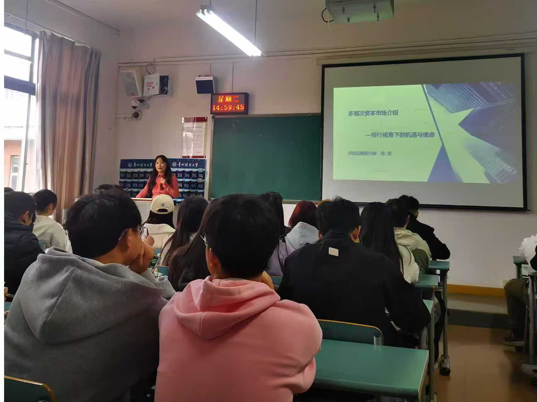 10月21日,贵304永利集团金融专硕教育中心成功举办线下专题讲座,特邀华创证券投资银行部执行总经理陈英担任主讲嘉宾,主题为《多层次资本市场介绍——投行视角下的机遇与使命》。讲座由金融专硕硕导组副组长马新松主持,全体金融专硕研究生参加。