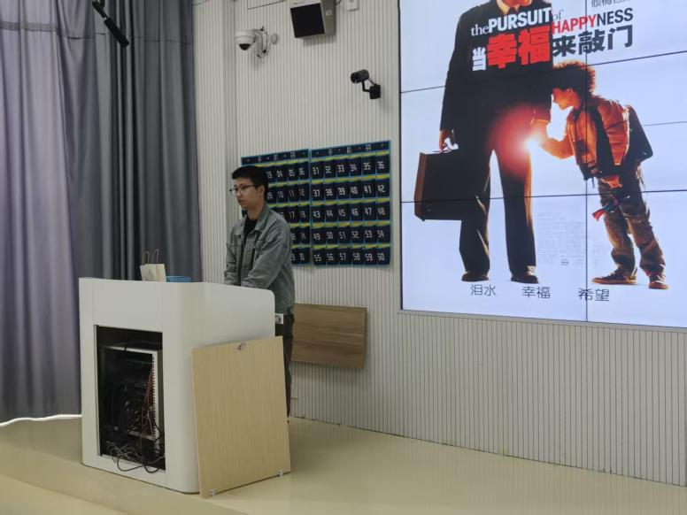 2022级金融工程王涛分享了对电影《当幸福来敲门》的深刻理解。他细致梳理了主角克里斯·加德纳从流浪汉到投资专家的人生轨迹,指出影片中“幸福”的拼写错误恰恰隐喻了幸福的“不完美”与“真实感”。“幸福从来不是命运的馈赠,而是奋斗的勋章,”王涛分享道,“它藏在追梦路上的脚印里,藏在‘再坚持一下’的决心里。‘敲门’,敲的不是命运的门,而是自己内心‘永不放弃’的门。”他特别提到影片中父子关系的动人之处,“儿子克里斯托弗不是单纯的附属者,而是父亲坚持的核心动力。他纯粹的信任和稚嫩的安慰,成为克里斯对抗困境的‘铠甲’。”