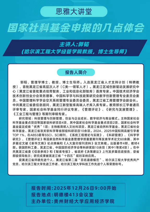 郭韬,管理学博士,教授、博士生导师。入选黑龙江省人才支持计划(特聘教授),首批黑龙江省高层次人才(C类—领军人才)。黑龙江区域创新驱动发展研究中心(黑龙江省首批重点培育智库,工业和信息化部智库)首席专家,中国技术经济学会技术创新创业分会常务理事,中国科学学与科技政策研究会数字创新管理专业委员会委员,中国管理科学学会空天系统管理专业委员会委员,黑龙江省工商管理学会副会长。中共黑龙江省委信息顾问,黑龙江新型智库高端人才库入库专家。教育部长江学者通讯评审专家,国家社会科学基金同行评议专家,《管理评论》、《研究与发展管理》、《工业工程与管理》等期刊审稿专家。